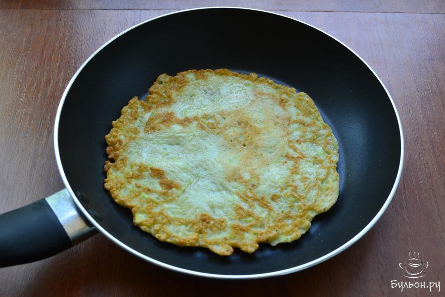 5. В сковороду влить 1 ч. Л. Растительного масла, разогреть и ложкой выкладывать тесто центр, размазывая его по диаметру сковороды. Жарить блины на среднем огне до румяного цвета.