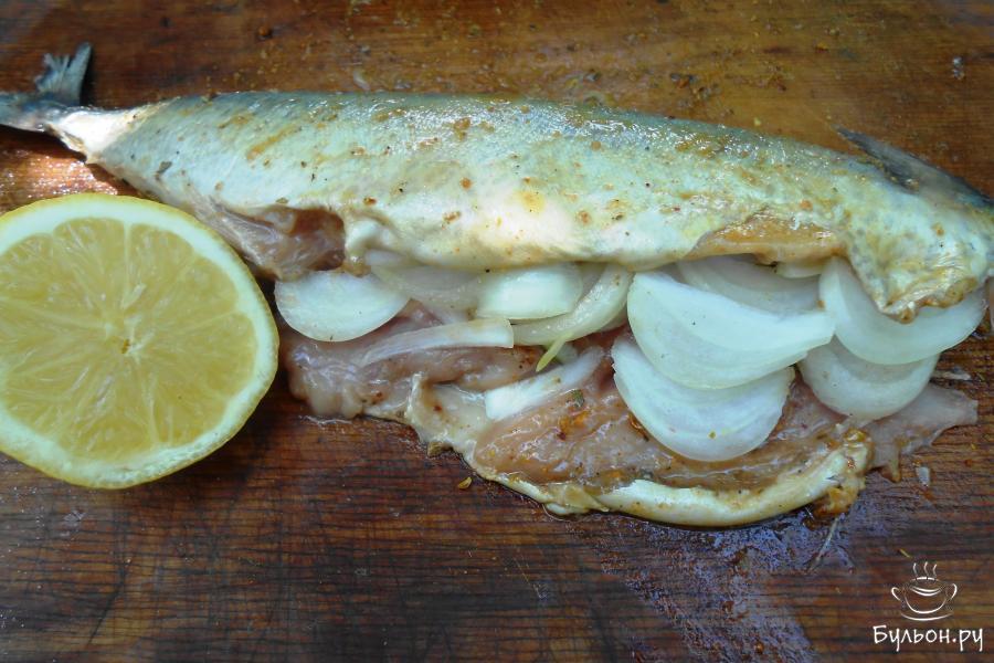 3. Во внутрь скумбрии уложить репчатый лук, нарезанный полукольцами и полить соком лимона. Оставляем для маринования на 35 минут.
