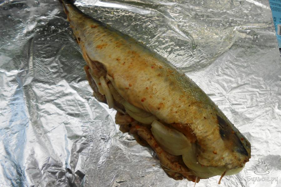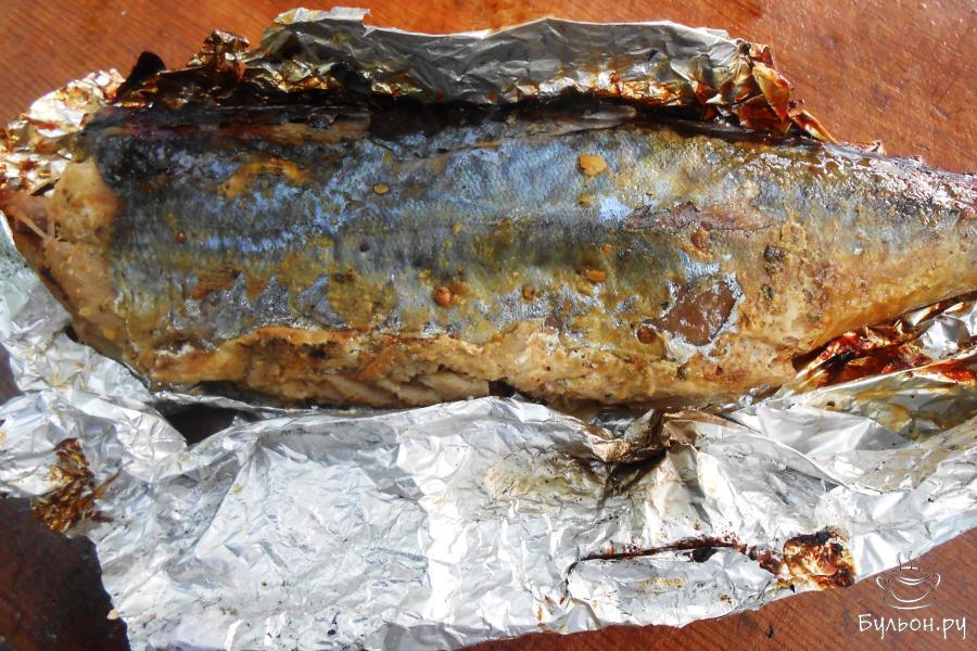 8. Скумбрия, запеченная в фольге на мангале готова. Разделите вдоль хребта на 2 порции. Подавайте к столу в горячем виде. Приятного аппетита.