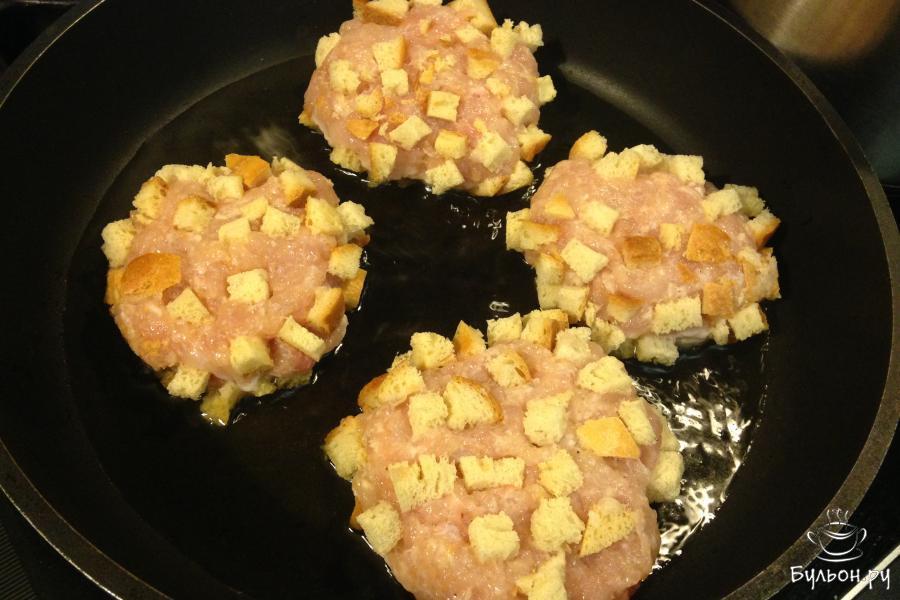 5. Мокрыми руками сформировать котлеты. Обвалять в сухарях, выложить на сковороду с раскаленным маслом, слегка приплющить.