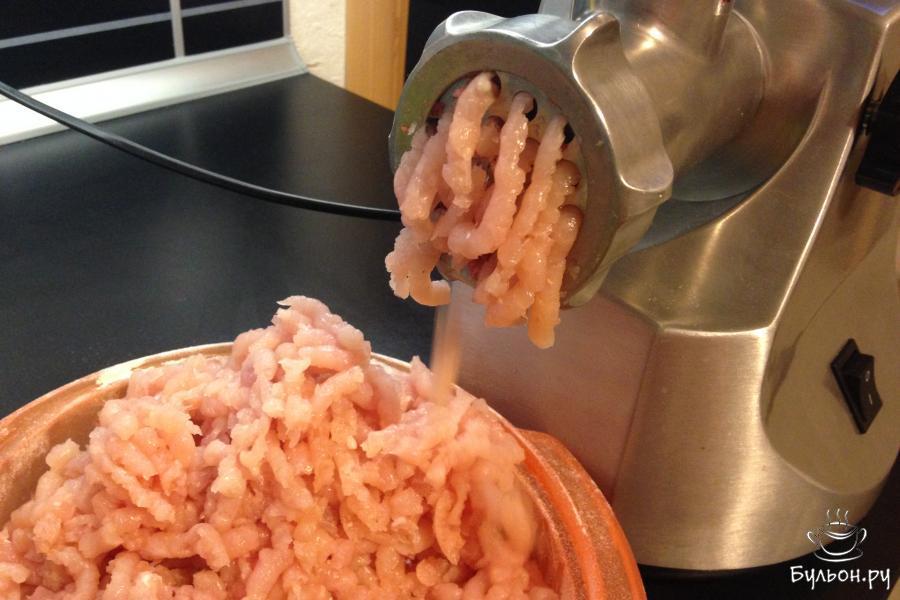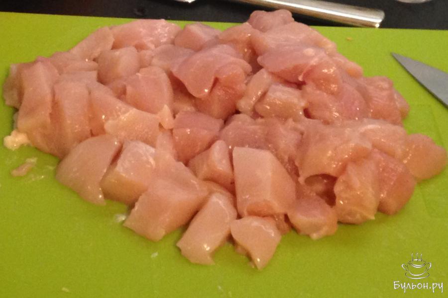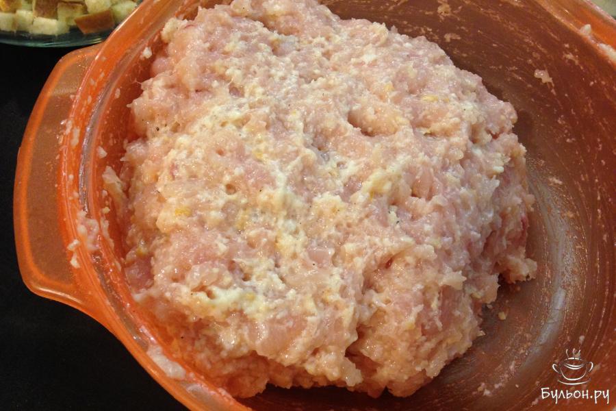 2. Куриное филе промыть, порезать на кусочки, размером с грецкий орех. В молоке вымочить кусочек хлеба, отжать.