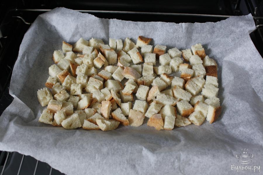 1. 200 г белого хлеба порезать мелкими кубиками, подсушить в духовке при температуре 150 градусов в течении 10 минут.