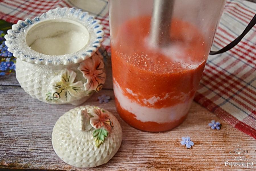 3. Сложим ягодки в подходящую посуду (это может быть стакан блендера или обычная стеклянная банка). Добавим сахарный песок.