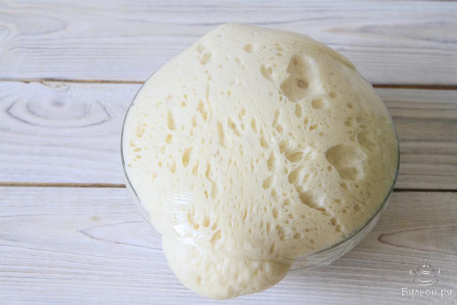 9. Миску с тестом обернуть пищевой пленкой и убрать в теплое место. Через 40 минут дрожжевое тесто у меня уже подошло.
