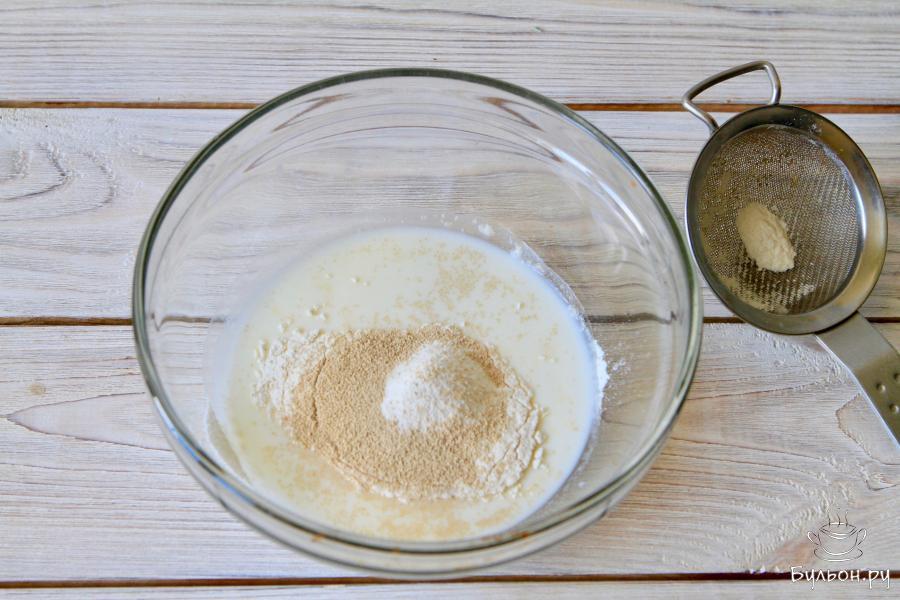 1. Приготовить опару: молоко слегка подогреть, добавить соль, 1 столовую сахара, 3 столовые ложки муки и сухие дрожжи