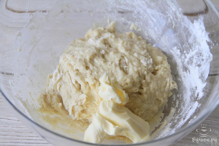 7. Заранее достать из холодильника сливочное масло, оно должно быть комнатной температуры раз, и мягкое два ( я достаю обычно за 30 минут до основного замеса). Добавить 50 гр сливочного масла в тесто.