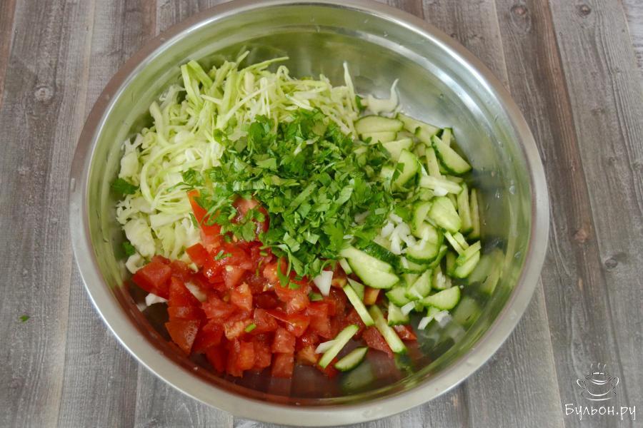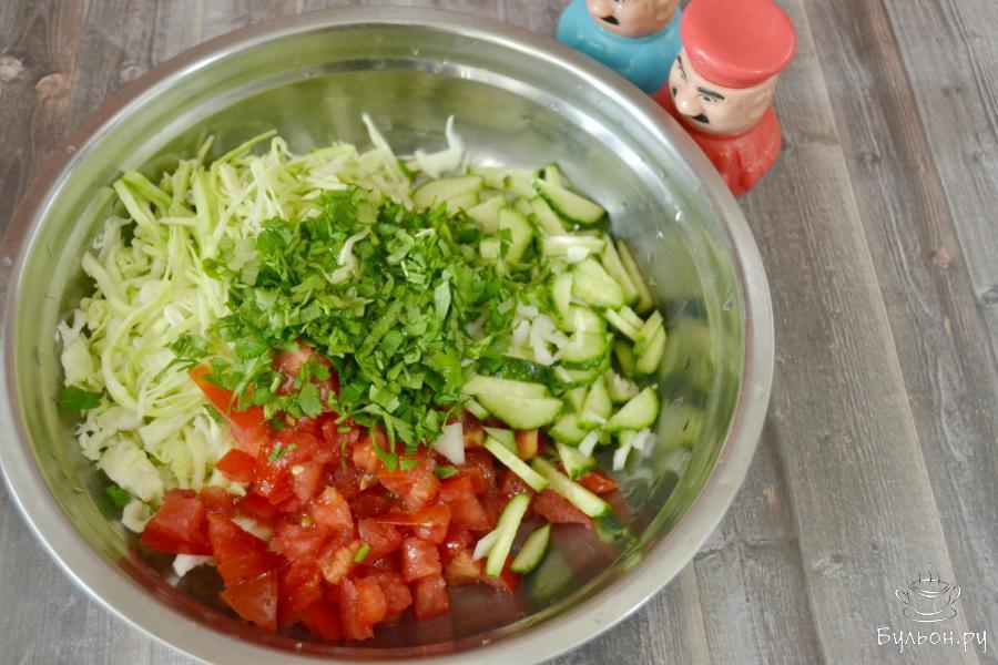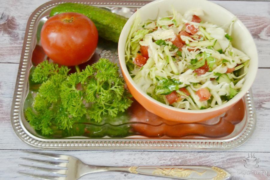 8. Салат из капусты с огурцами и помидорами готов. Используем его к картошке, рассыпчатым кашам, макаронам и так далее.