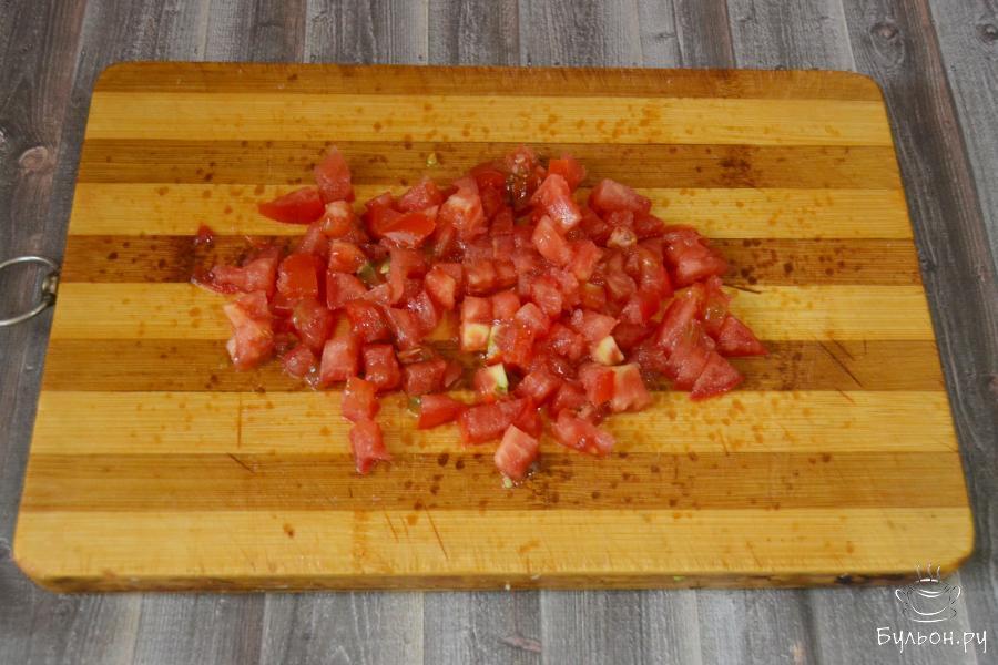 2. Помидоры нарежем кубиками. Чтобы не было лишнего сокоотделения, выберем томаты спелые, но плотные.