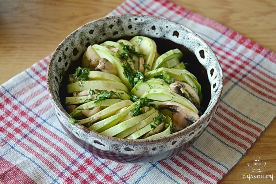 В летнее время и меню - летнее. Кабачок созревает раньше, чем другие овощи: уже в конце весны появляются в продаже привозные плоды, а позже - и с огорода. Вот и в пищу кабачки используются весьма широко, как самостоятельно, так и в сочетании в другими продуктами. Сегодня предлагается рецепт кабачков, запеченных в духовке с грибами. Плоды для этого рецепта нужно отобрать молоденькие с тонкой шкуркой. В зрелых кабачках, как правило, и семена уже зрелые, часто с уже плотной оболочкой. Кушать такие плоды не очень приятно, поэтому, если вы используете крупные зрелые кабачки, то и внутреннюю часть с семенами нужно будет удалить.