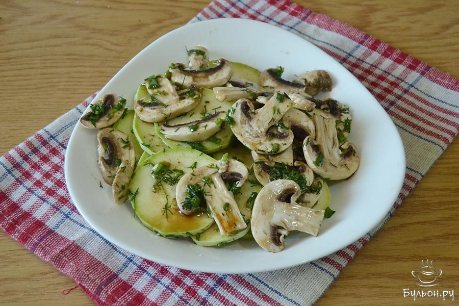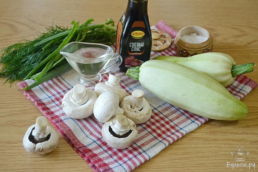 5. Сложим кабачки и грибы во вместительную тарелку, желательно глубокую. Посолим, поперчим, добавим подсолнечное масло и соевый соус. Перемешаем и оставим мариноваться на час-два.