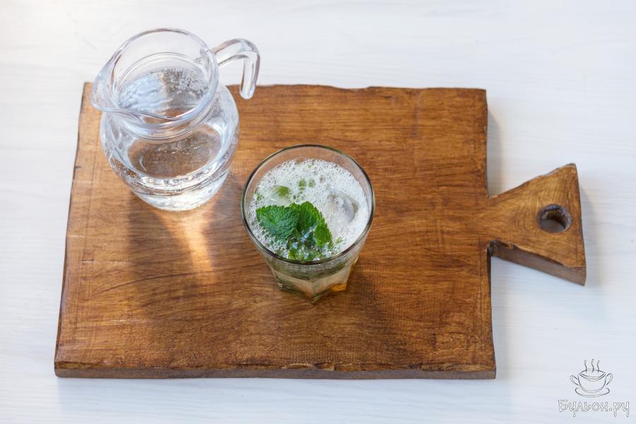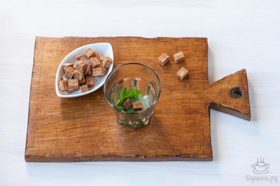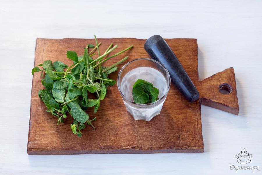 2. Отделите 5-6 листьев мяты от стебля, поместите в бокал и слегка примните пестиком, для того чтобы мята раскрыла свой аромат. Если пестика под рукой не оказалось можно просто слегка прихлопнуть листья мяты ладонью.