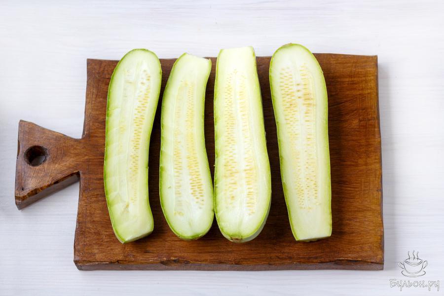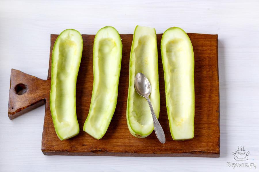7. Используя чайную ложку, или другой подручный предмет, удалите семена. У вас получилась импровизированная "лодочка" из кабачка.