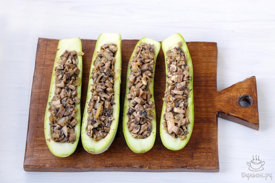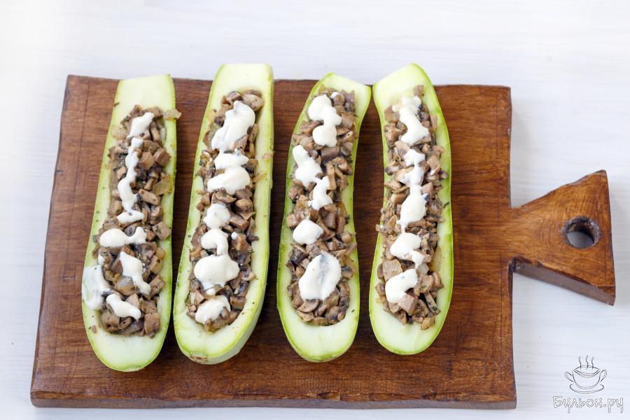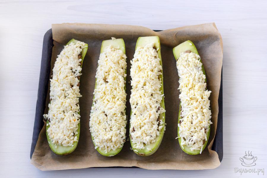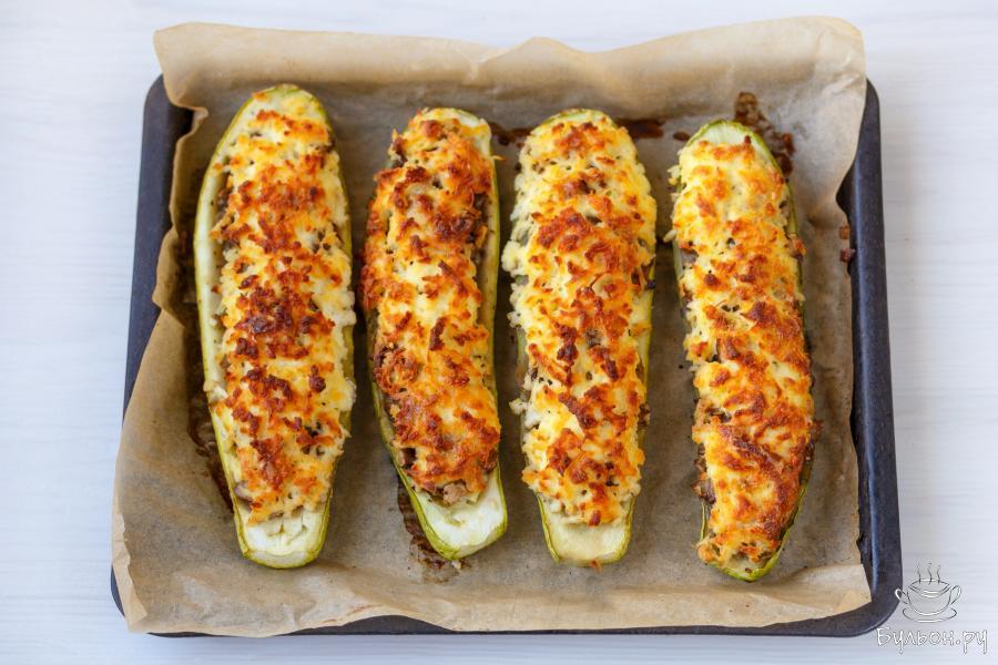 11. Поместите лодочки в разогретую до 175 градусов духовку, и прикрыв фольгой и выпекайте 25-30 минут, пока кабачки не станут мягкими. Затем удалите фольгу и выпекайте блюдо еще 10-15 минут пока сыр не подрумяниться.