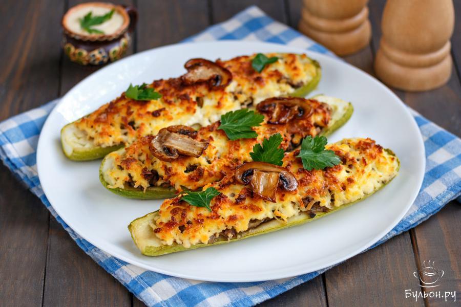 Лодочки из кабачков - универсальное блюдо. Сытное, простое, вкусное и незатейливое в приготовлении - находка как для праздничного застолья, так и для повседневного меню. Это идеальный вариант легкого обеда или ужина, который можно приготовить без особых хлопот. Нейтральный вкус, нежность и сочность кабачков позволяют смело экспериментировать, добавляя в качестве начинки грибы, мясо, сыры, сезонные овощи и травы. Сегодня предлагаю приготовить один из самых легких, низкокалорийных вариантов блюда - лодочки из кабачков с грибами и сыром.