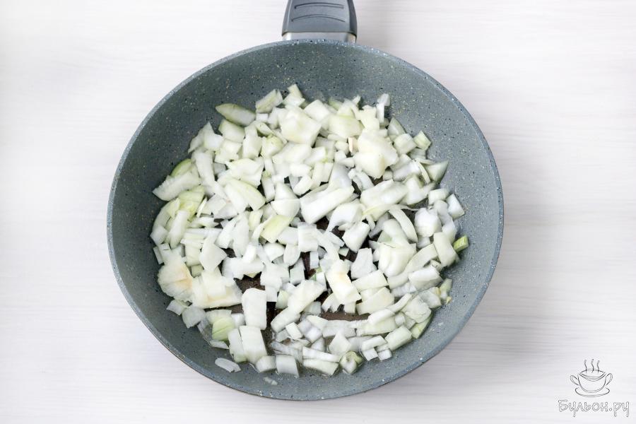 2. Разогрейте 1 столовую ложку растительного масла, добавьте подготовленный лук и 1-2 щепотки соли. Помешивая, обжарьте лук 5-7 минут, пока кусочки не станут мягкими, и слега подрумянятся.