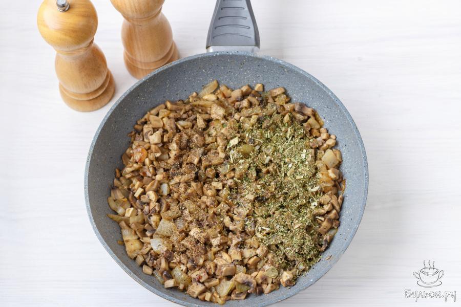 5. Выключите огонь и добавьте по вкусу соль, сушеные травы и молотый черный перец. Начинка для лодочек из кабачков готова.