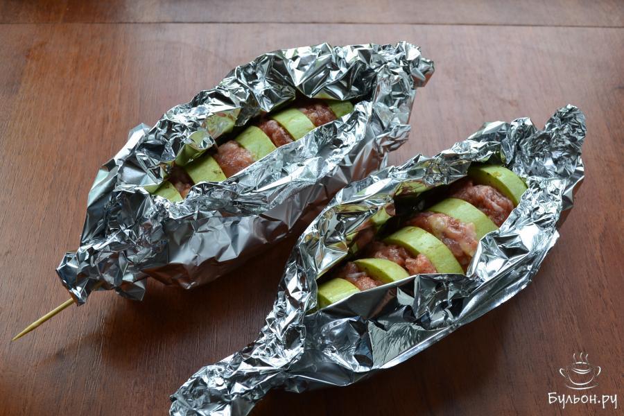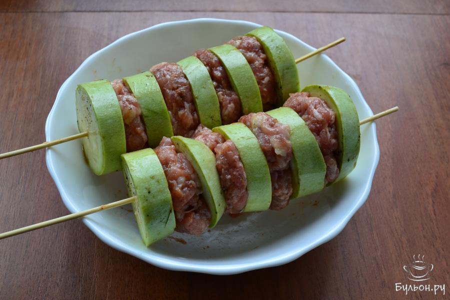 4. На шпажки из дерева нанизать кабачки и сформированные тефтели из фарша поочередно. Начинать нанизывание и заканчивать нужно кабачками.