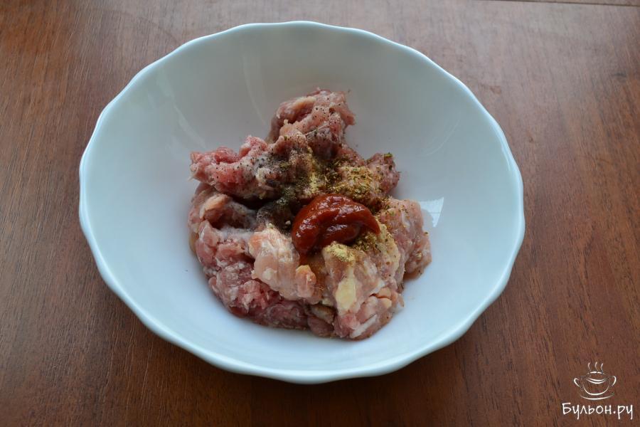 2. К фаршу добавить томатную пасту, приправу и по вашему вкусу - соль, чесночный порошок, поперчить.