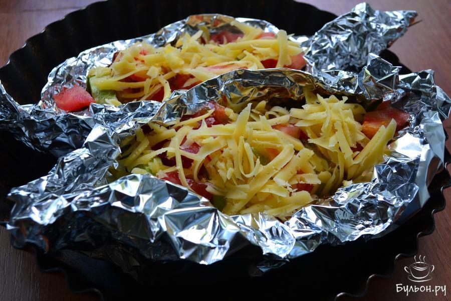 6. Поместить подготовленную закуску в любую форму, предназначенную для выпечки и отправить в духовку на пол часа. Запекать закуску при 170-180 град. Затем вынуть, выложить сверху порезанный кубиками свежий помидор и натертый сыр, вернуть в духовку еще на 10 минут.