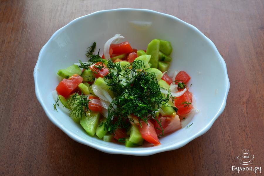 6. Затем маринад слить, в салат добавить измельченный зеленый укроп и заправить ароматным любым растительным или подсолнечным маслом.