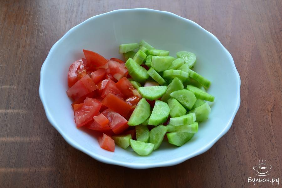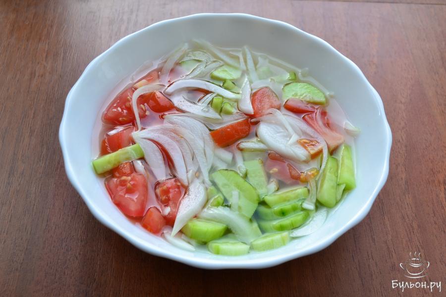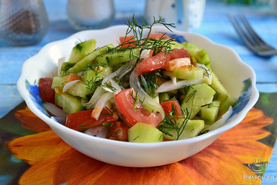 Предлагаю вам приготовить отличный быстрый маринованный салат из помидоров и огурцов. Салат получается малосольным и очень вкусным. Подать его можно с отварным картофелем, мясом, рыбой. Лучше всего заправить этот салат ароматным домашним подсолнечным маслом. Попробуйте, готовится салат просто и через час он уже готов к употреблению. Для лучшего результата, огурцы выбирайте молодые, зеленые с недозрелыми семенами. Помидоры - свежие и плотные.