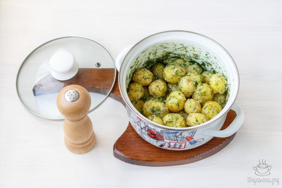 8. Прикройте кастрюлю крышкой и встряхните несколько раз, для того чтобы растопленное сливочное масло, зелень и специи равномерно распределились в кастрюле. Позвольте картофелю настояться под крышкой еще 5-10 минут, а затем подавайте к столу.