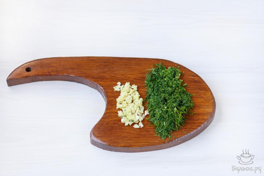5. Тем временем мелко нарежьте укроп и зубчики чеснока. Добавьте к нарезанным зубчикам чеснока 1 щепотку соли и слегка разотрите, прижимая плоской стороной ножа, пока чеснок не даст сок.