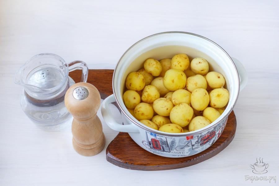 3. Поместите картофель в кастрюлю. Залейте клубни холодной водой, в таком количестве чтобы вода покрывала картофель слоем толщиной 2-3 см. Добавьте 1-2 щедрых щепотки соли.
