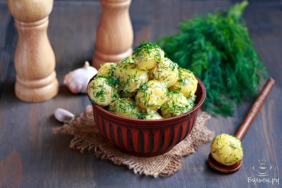 Отварной молодой картофель дополненный свежей зеленью и пряными кусочками чеснока - очень простое, но невероятно вкусное блюдо, которое должен попробовать каждый. Пропитанная растопленным сливочным маслом, приправленная душистым укропом и окутанная аппетитным ароматом чеснока, нежная мякоть молодого картофеля получается невероятно нежной и соблазнительной на вкус. Такое легкое, незатейливое в приготовлении и эффектное на вкус блюдо украсит и праздничный стол и повседневное меню, и в зависимости от ситуации станет отличным гарниром, закуской и самостоятельным блюдом. Для лечебных диет под номерами 1, 2, 4в, 5, 7-10, 10и, 10с, 11, 15 чеснок нужно исключить.
