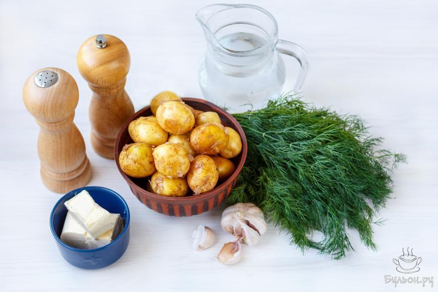 1. Для приготовления блюда вам понадобятся такие компоненты: молодой картофель небольшого размера, укроп, чеснок, сливочное масло и соль. Также, вода для варки картофеля и, по желанию, немного молотого черного перца.