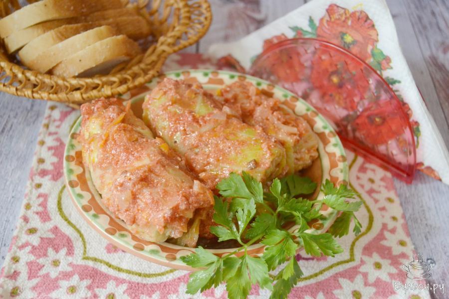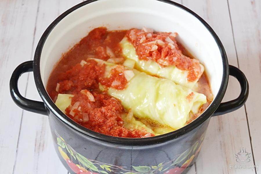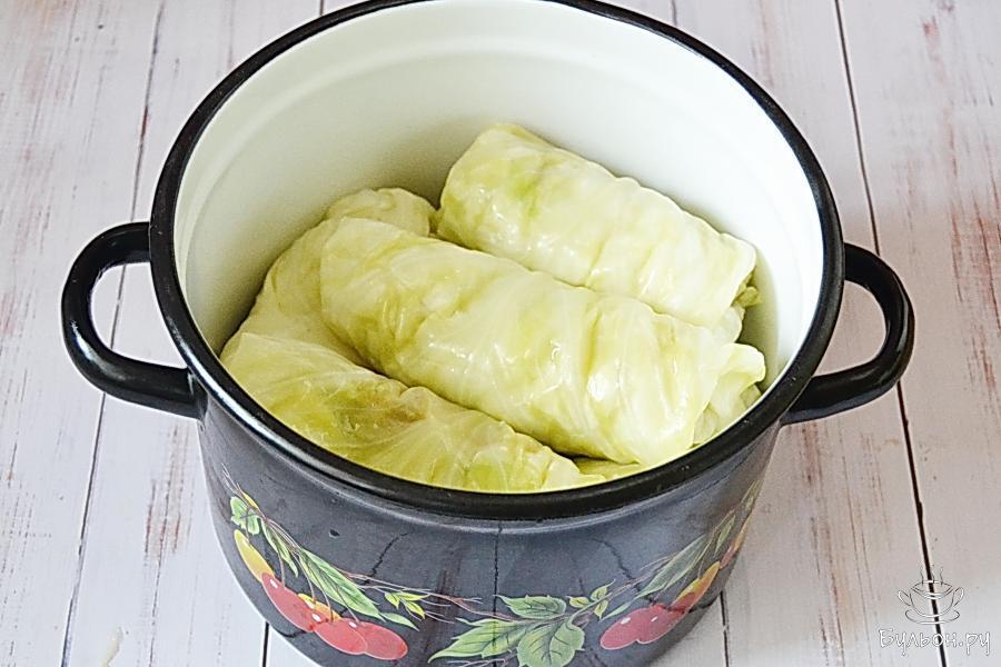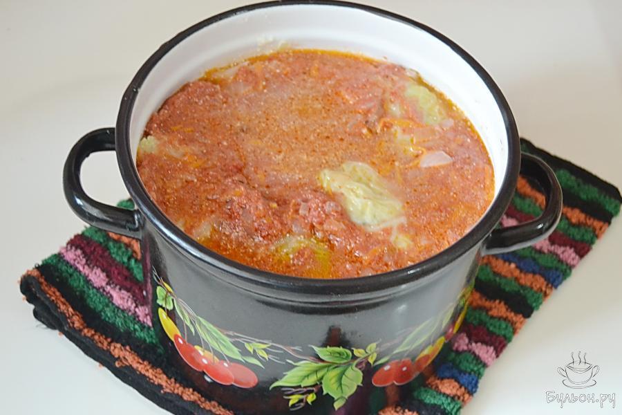 12. Добавить воды, чтобы голубцы были покрыты жидкостью, посолить. Варить часа полтора при слабом кипении, накрыв кастрюлю крышкой. В конце можно крышку приоткрыть, выпарить часть жидкости, поперчить. Тогда у нас получатся голубцы в томатном соусе.