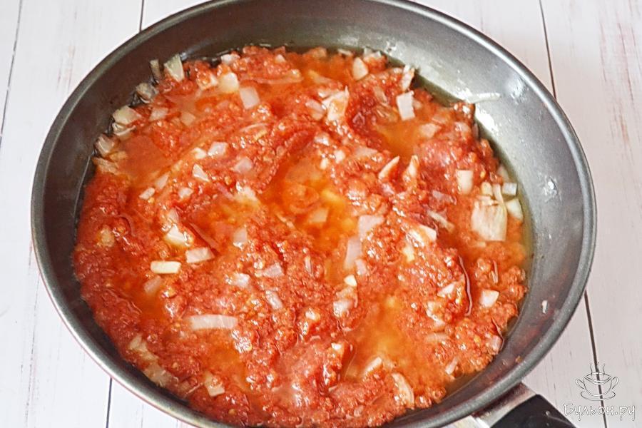 6. Половину пассеровки мы положили в фарш, а в оставшуюся добавить томатную пасту, прожарить. Летом и осенью пасту можно заменить свежими помидорами, натертыми на терке.