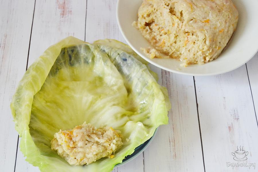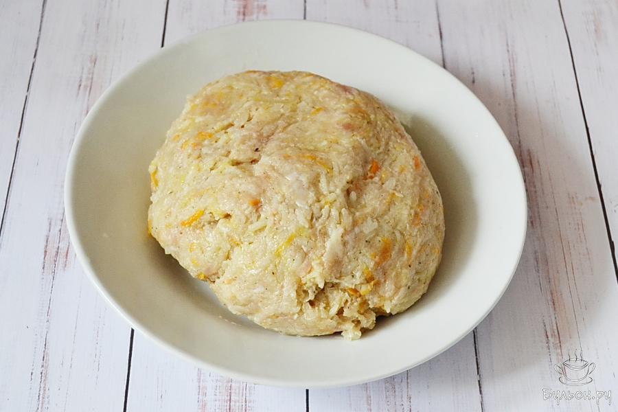 4. Половину пассеровки добавить к свиному фаршу, а вторую оставить для приготовления подливы. Слегка (не до конца) отварить рис. Добавить в фарш рис, соль и перец, перемешать.