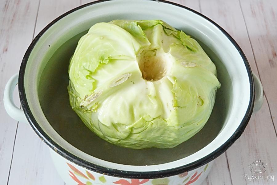 1. Для начала нам необходимо удалить серединку из капустного кочана. Без кочерыжки листочки для голубцов будет легче отделить от кочана.