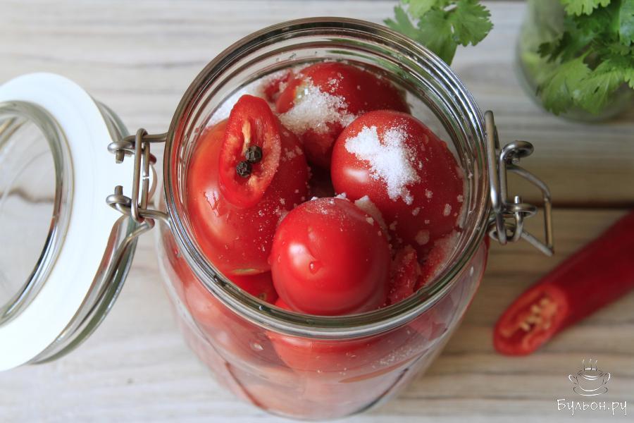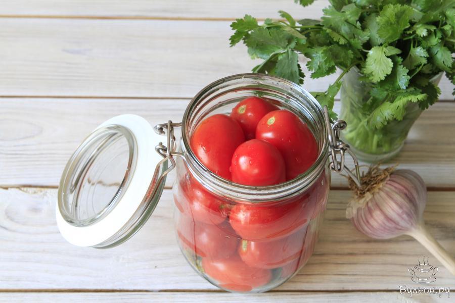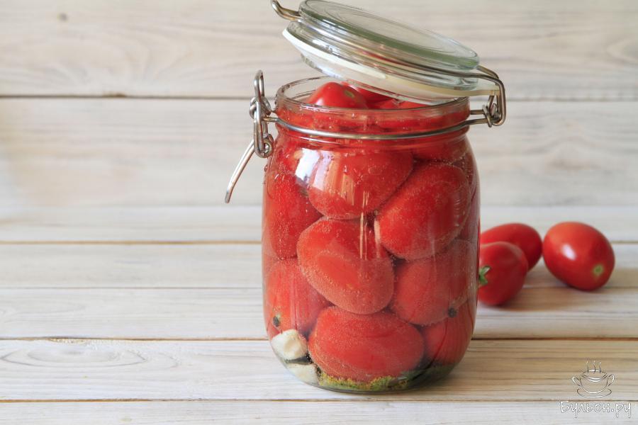 8. Банку закрыть крышкой, взболтать ее пару раз и убрать в холодильник на сутки. Через сутки можно быстрые малосольные помидоры подавать к столу.