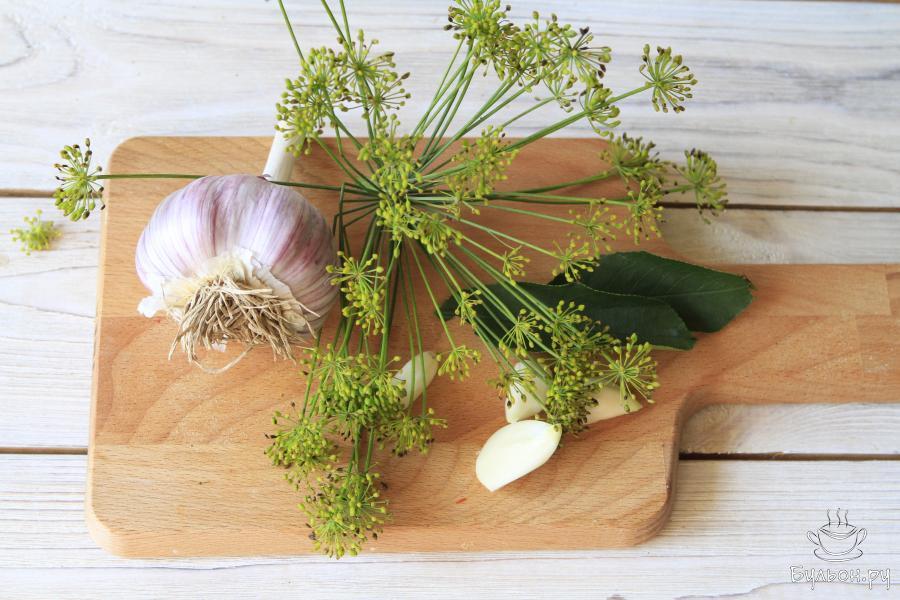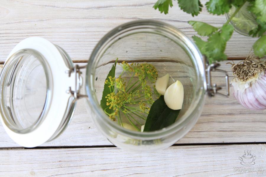 4. Банки нужно будет подготовить заранее: помыть, простерилизовать удобным способом вместе с крышками. На дно банки уложить укроп, листья вишни и дольки чеснока.
