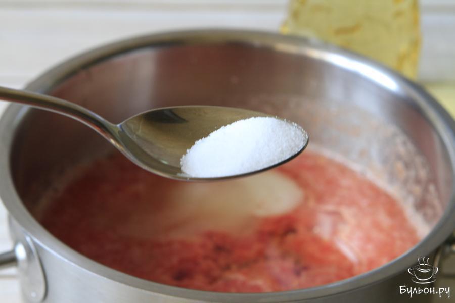 6. Кастрюлю с томатами установить на плиту, довести до кипения. Далее пробить их слегка блендером. Добавить соль, сахар и растительное масло.