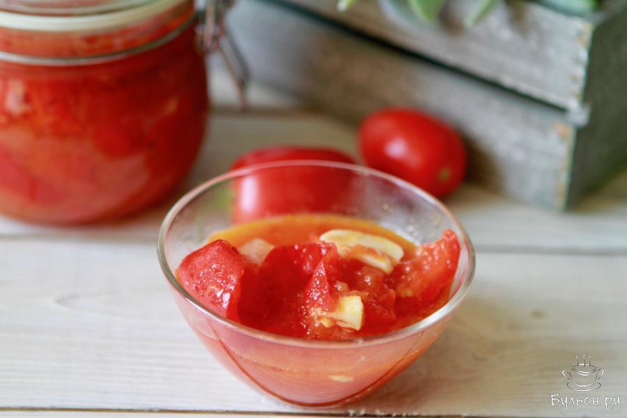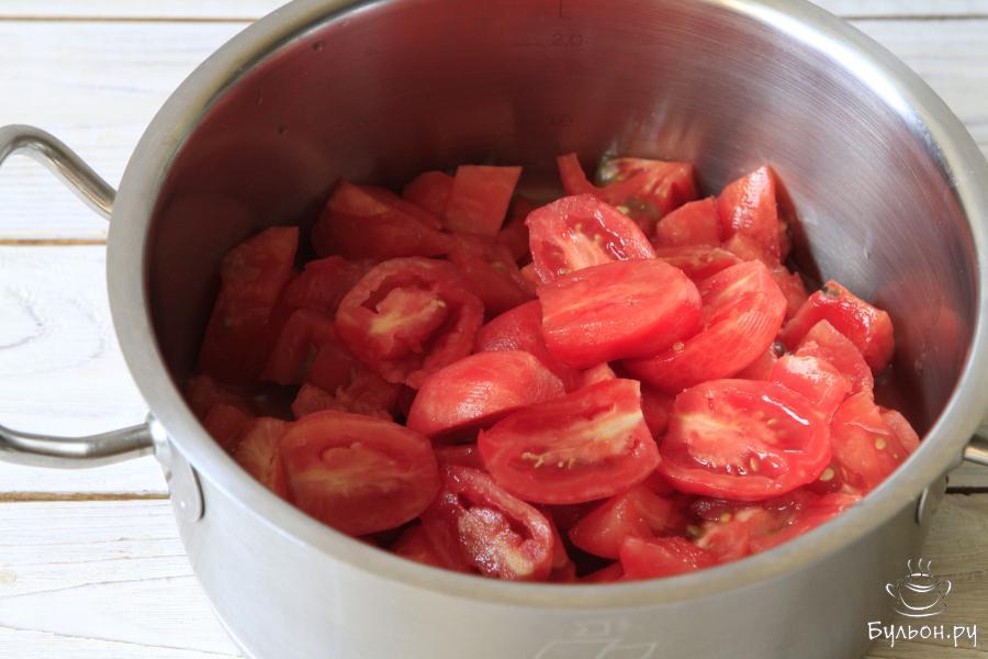 2. Помидоры промыть и обсушить, аккуратно снять кожуру. Для удобства на помидорах сделать надсечку, ошпарить кипятком. Готовые помидоры порубить ножом.