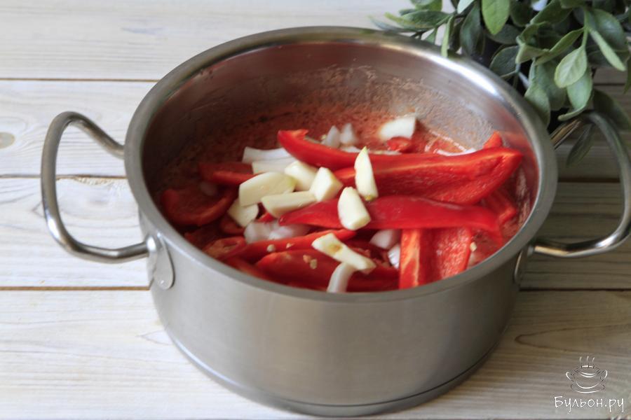 7. Следом добавить все подготовленные овощи: болгарский перец, перец чили, лук и зубчики чеснок. Уваривать лечо на медленном огне в течение часа.