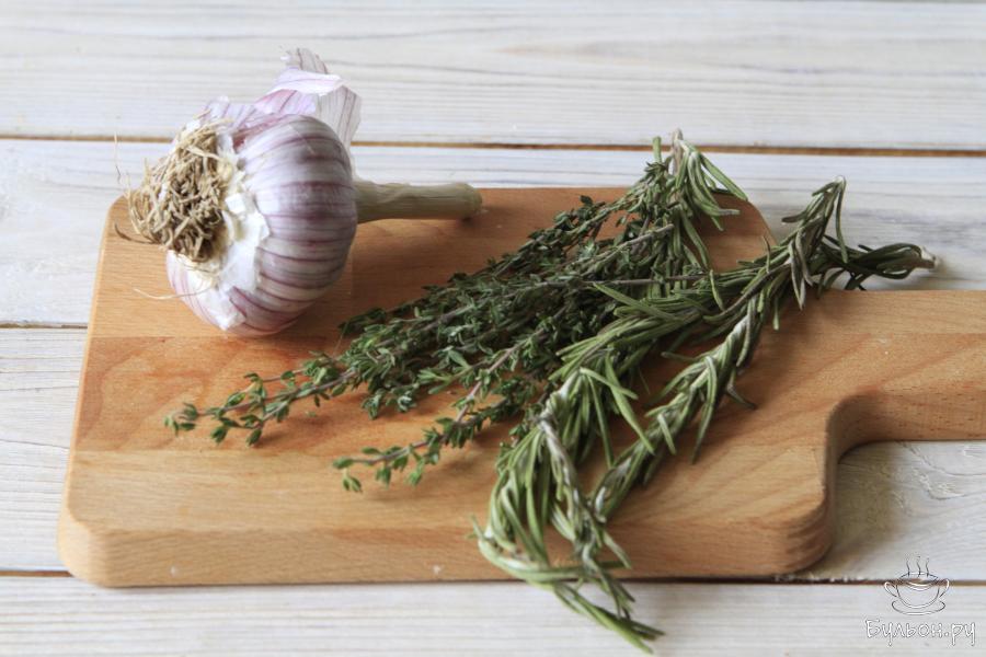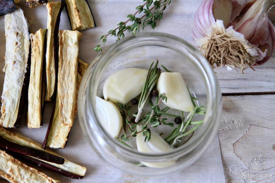 6. На дно чистой сухой банки уложить 3 зубчика чеснока, веточку тимьяна, розмарина и черный перец горошком.