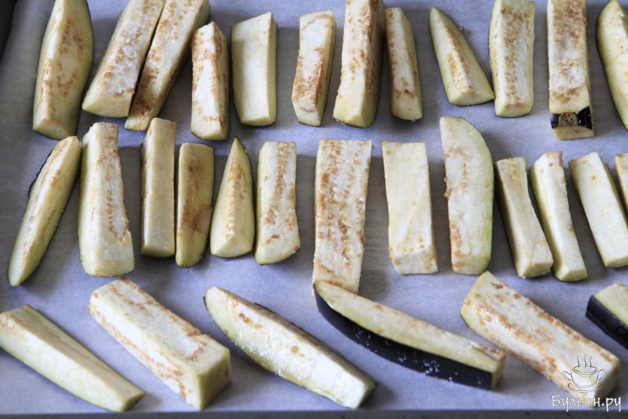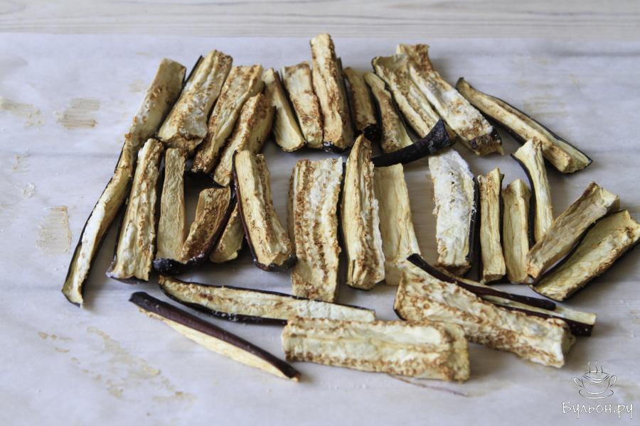 3. Противень застелить листом пергамента и выложить на него брусочки баклажан. Баклажаны отправить в духовку на 2 часа и высушивать при температуре 90 гр.