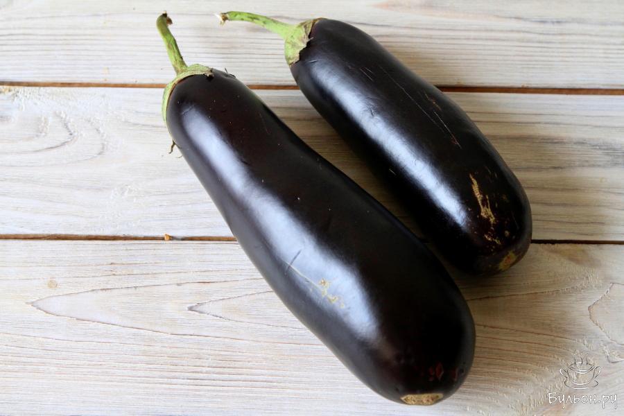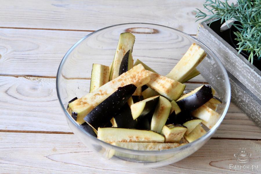 2. Срезать у них попки и нарезать на небольшими брусочками. Переложить баклажаны в глубокую чашу, присыпать солью и хорошо перемешать. Оставить баклажаны в сторону на 15 минут.