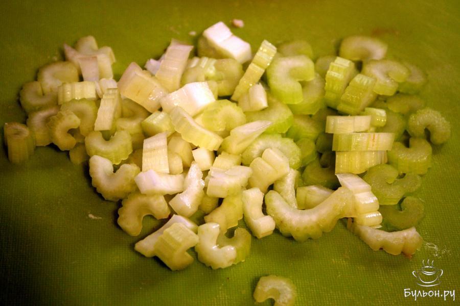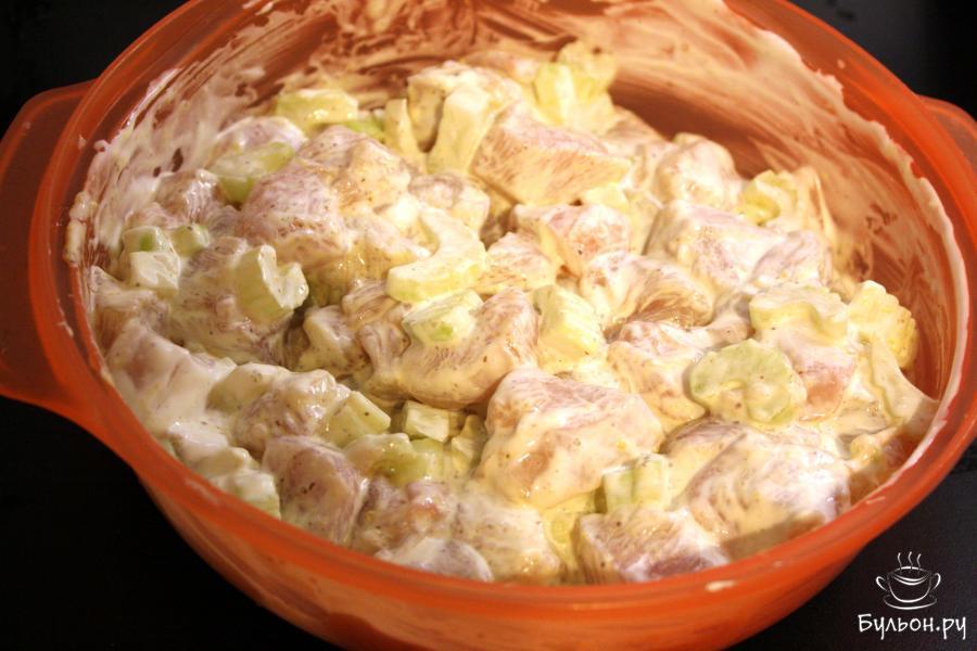 4. Филе смешать с овощами, йогуртом и горчицей, посолить, поперчить. Оставить мариноваться на 20-30 минут.