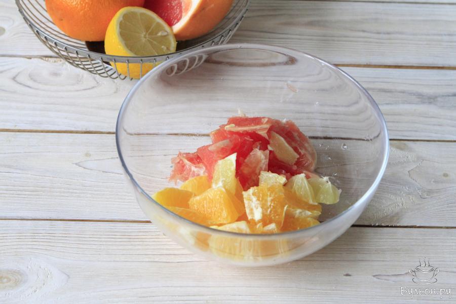2. Аккуратно очистить цитрусовые от кожуры. Ее не стоит выбрасывать, она еще может пригодиться. А вот мякоть очистить от косточек, перегородок, пленки и переложить в чашу.