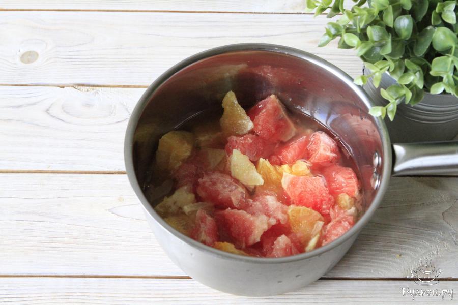 5. Мякоть цитрусовых перекладываем в сотейник или кастрюлю, вливаем немного воды и отправляем на плиту. Увариваем мякоть не среднем огне в течении 2-2.5 часов.