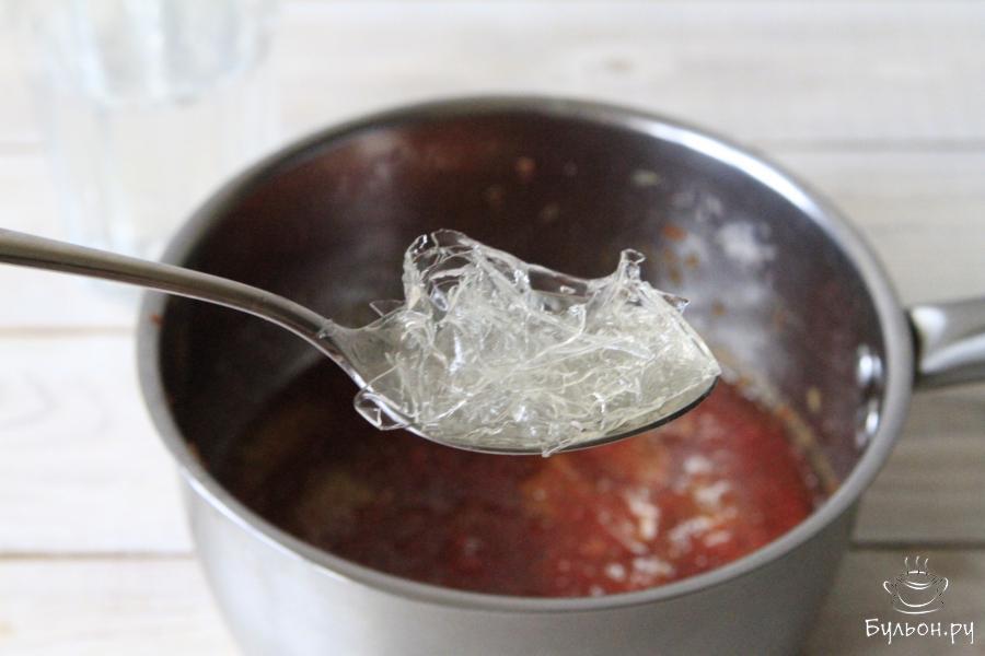 7. В моем случае это листовой желатин. Его замачивают в небольшом количестве жидкости на 5 минут. Далее необходимо его достать, отжать и добавить в готовый джем.