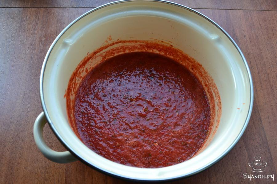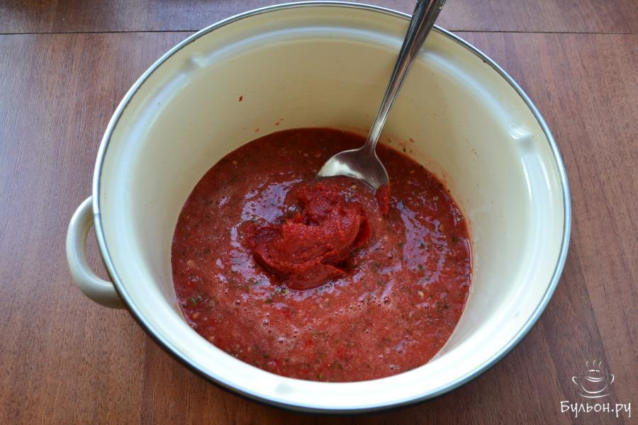 4. Измельчить все блендером на высокой скорости, чтобы масса была однородной, переложить ее в кастрюлю. Добавить томатную пасту, размешать.