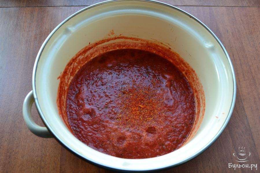 7. Добавить щепотку имеретинского шафрана, снова все перемешать. Если нет такого шафрана, можно готовить и без него. Кипятить соус на медленном огне, при периодическом помешивании 15-20 минут. Соус немного уварится, станет гуще, раскроются все специи и соус приобретет бархатистую структуру.