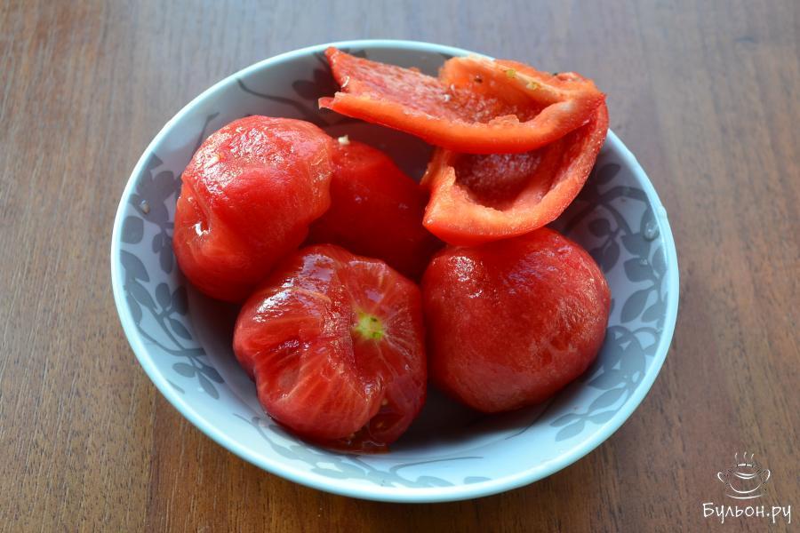 1. Помидоры очистить от кожицы любым удобным для вас способом: можно залить кипятком на пару минут и снять кожицу, можно просто очистить ее ножом. Перец болгарский очистить от семян.
