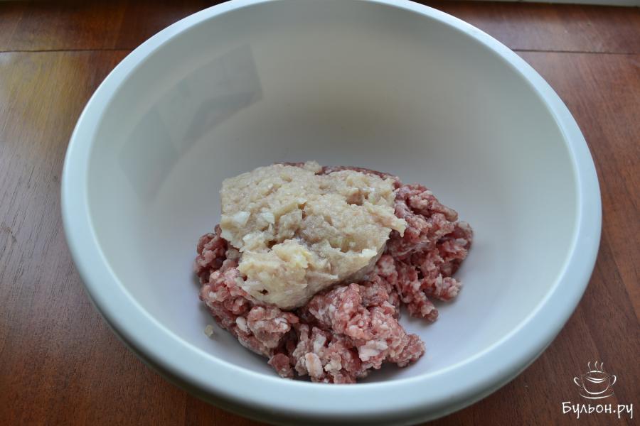 2. Измельчить лук с чесноком в блендере до кашицы, добавить ее к свиному фаршу. Фарш можете использовать и другой.